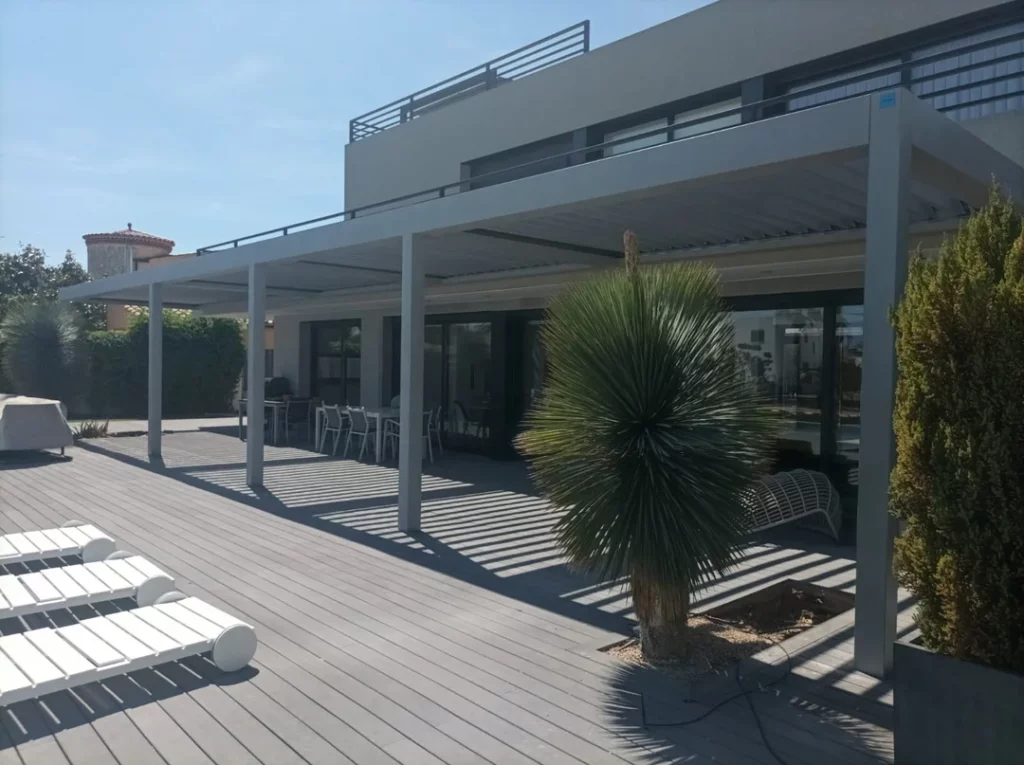 S’han instal·lat quatre pèrgoles Alba de Corradi, acoblades entre si, formant una única estructura contínua que ofereix protecció solar, ventilació regulable i un disseny de línies netes i modernes.