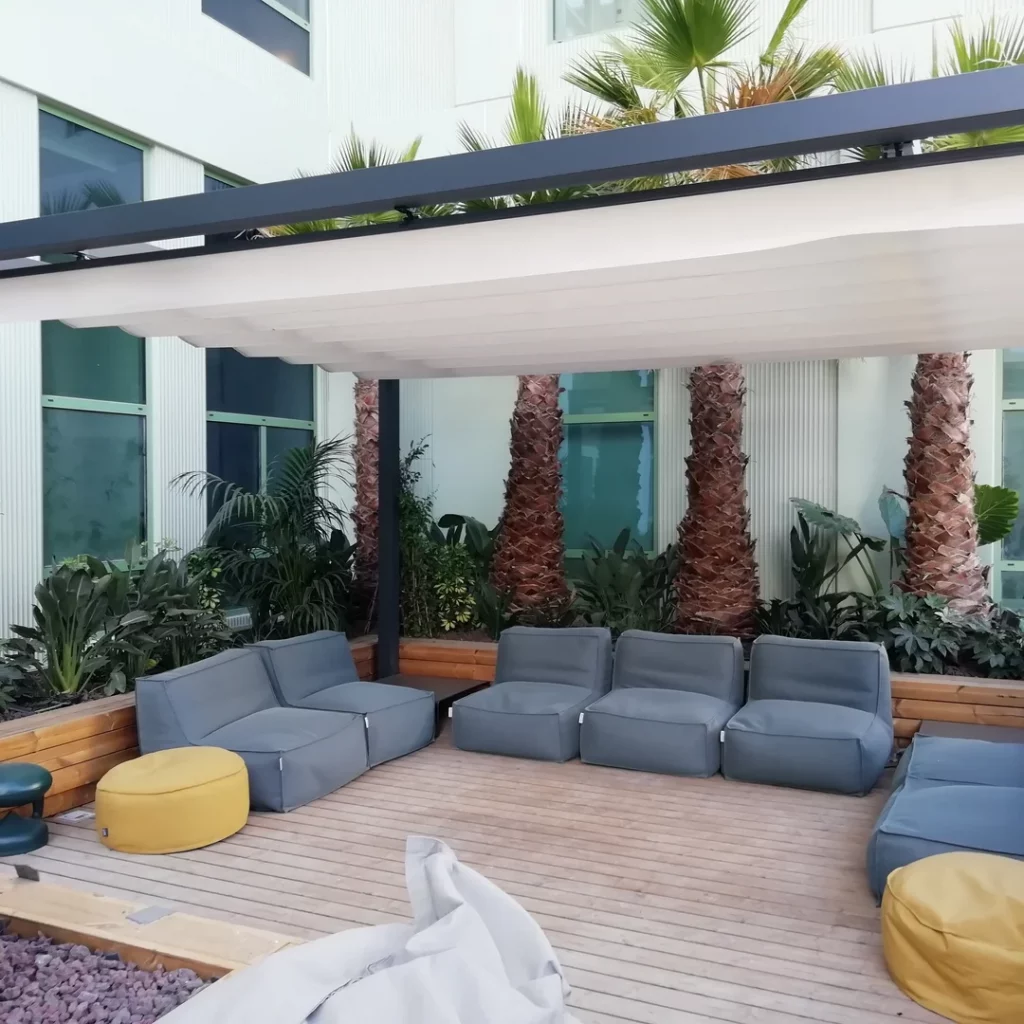 Aquesta solució aporta valor funcional i estètic al conjunt, ampliant l’àrea d’ús exterior i millorant el confort climàtic per als usuaris en qualsevol època de l’any.